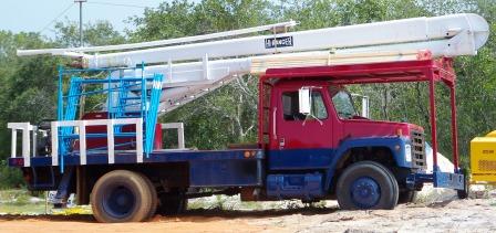 ... The boom truck, pictured on the left, got stuck in the soft sand, just 10 feet into the lot. This did not seem to be a good omen at the time. About an hour later, the truck was dug out and we had some head scratching and brainstorming to do. |