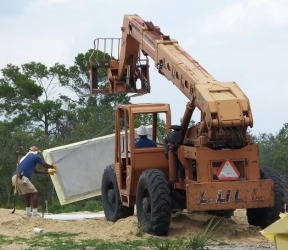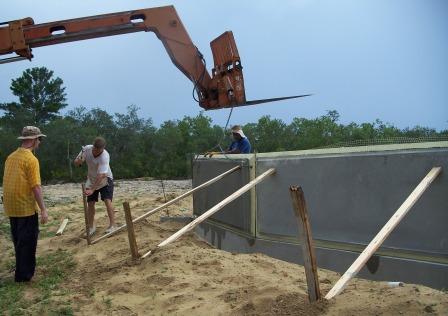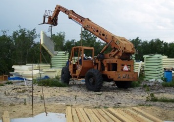 The final solution - rent a Lull. This is an all-terrain crane/fork-lift that can manuever in the soft sand of our lot. After several phone calls and lots of prayer, we found a Lull in Sebring. 3 hours later, it was delivered and put to immediate use. In the above picture, you see Basil (left) setting the panel in place while Billy operates the Lull. |