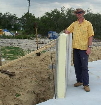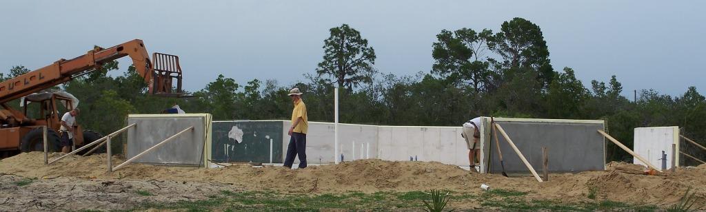 Ahhh... the first panel, in place and secured by 2x4s wedged into the sand. Progress indeed. The panel Bruce is standing next to weighs about 300 lbs. To all of you who interceded for us this afternoon, know that God answers prayers. It may turn out the soft sand was a blessing waiting to be found as we are saving almost $500 a week renting the Lull instead of the boom truck. |