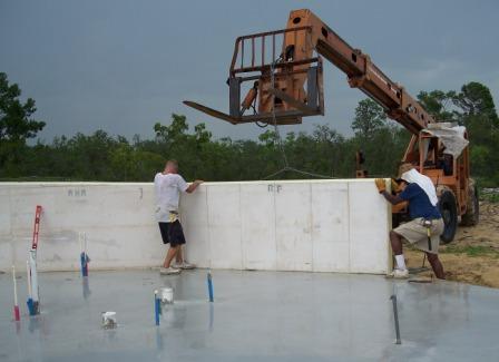 Here is a long shot of what had been accomplished as of ~5:30 pm today. There are 5 riser panels in place now. As I was leaving, Bob, the other consultant, was getting ready to set some entryway panels and they were going to begin cementing the joints between the riser panels. Tomorrow the plan is to begin the first layer of triangular panels. Everyone got a lot accomplished once the Lull arrived and I am impressed by the work ethic of all!