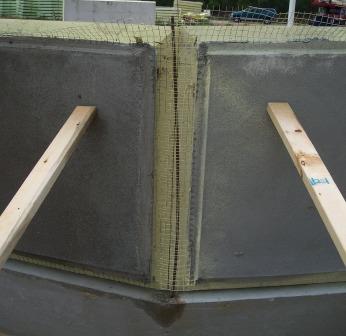 And a close-up of how the 2 riser panels join together. The rebar is a long way into the concrete and the steel mesh of the panels is layered in front of it. Once the concrete is worked in and has hardened, the riser wall will be strong enough to support the second layer of panels. |