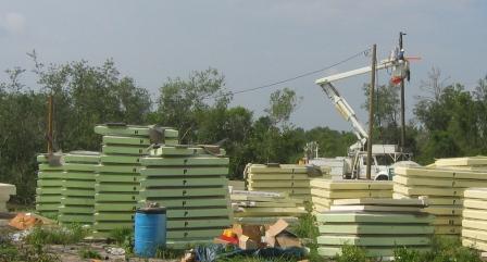 June 21 2007 - Today seemed to get off to a much better start. When Bruce arrived at the lot to check on things he found Progress Energy connecting power to our temporary pole. This means we won't be paying to rent a generator, which saves about $30/day, less the cost of whatever electricity we consume. |